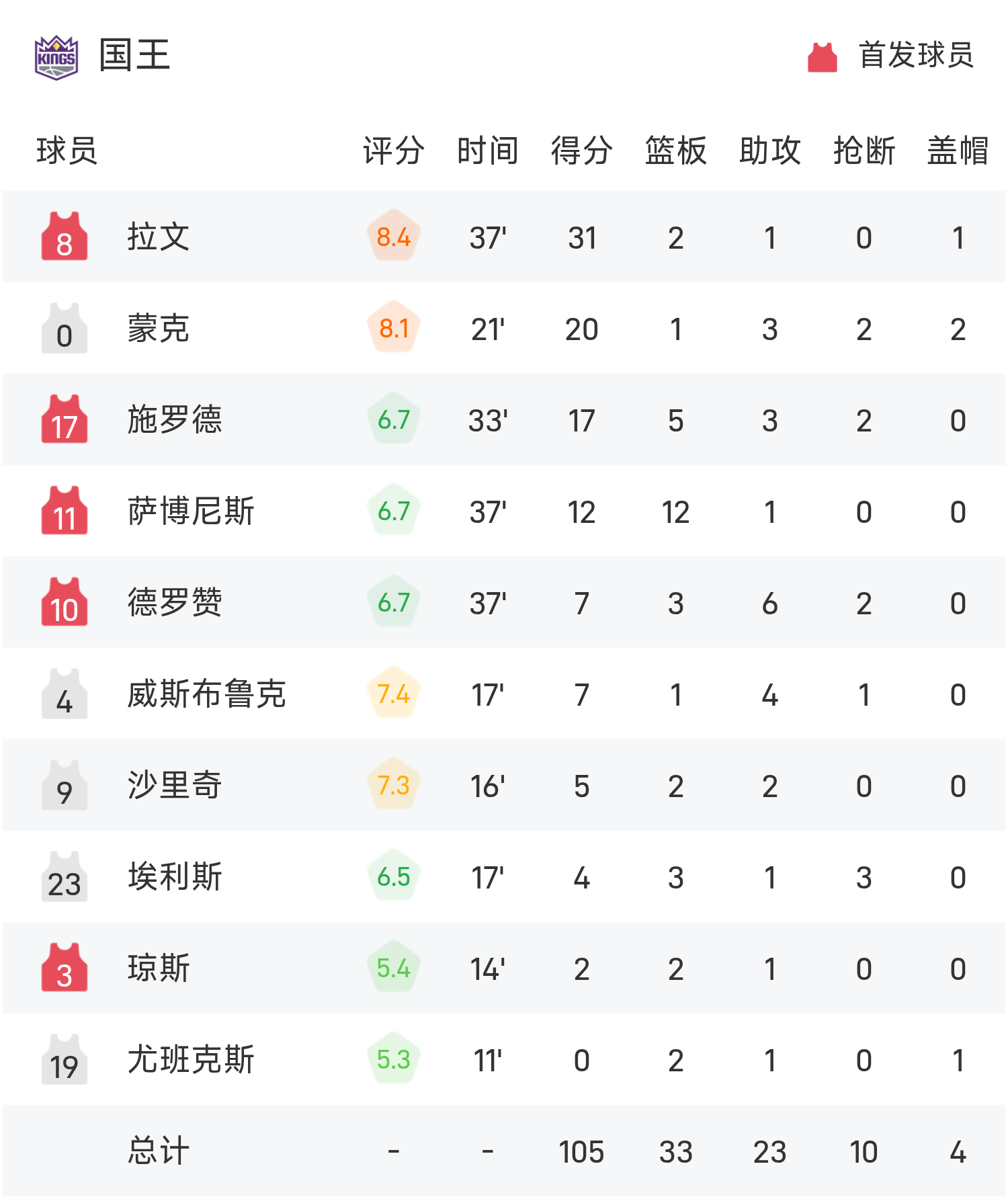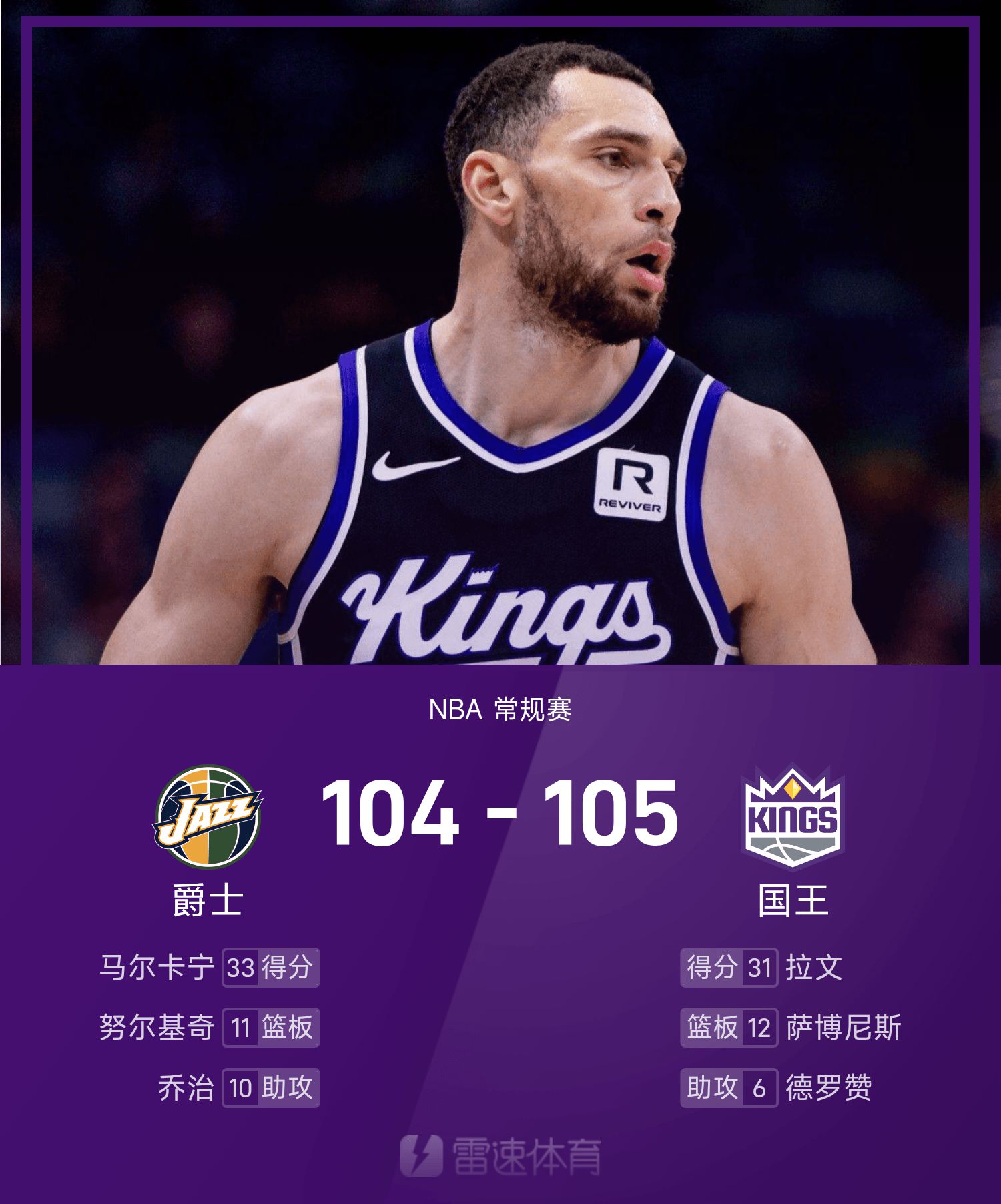 รายงาน NBA: ลาวีนทำ 31 แต้ม คิงส์เอาชนะแจ๊ส 105-104 อย่างหวุดหวิด