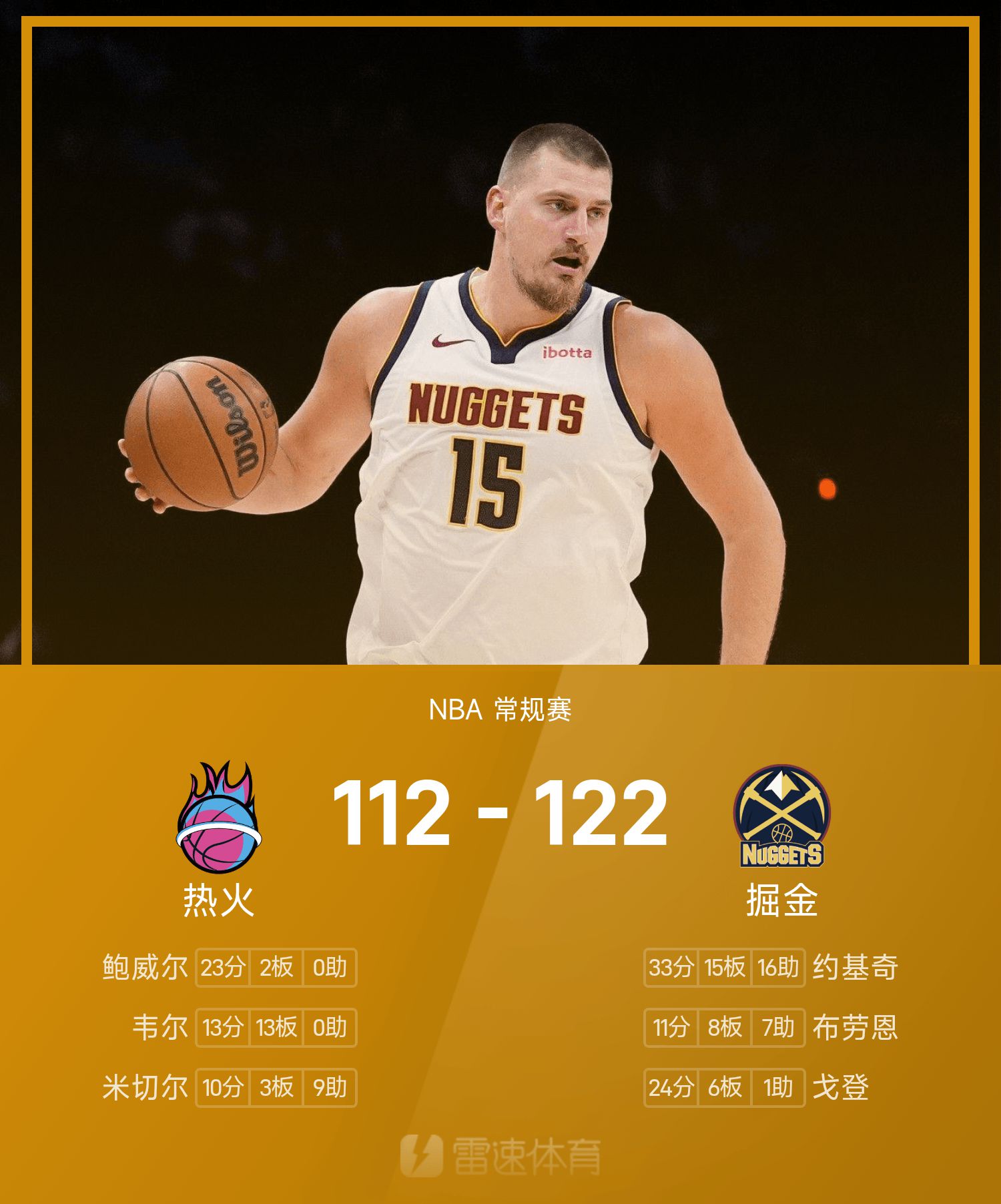 รายงานเกม NBA โยคิช 33 แต้ม 15 รีบาวด์ 16 แอสซิสต์ นักเก็ตเอาชนะฮีต 122-112