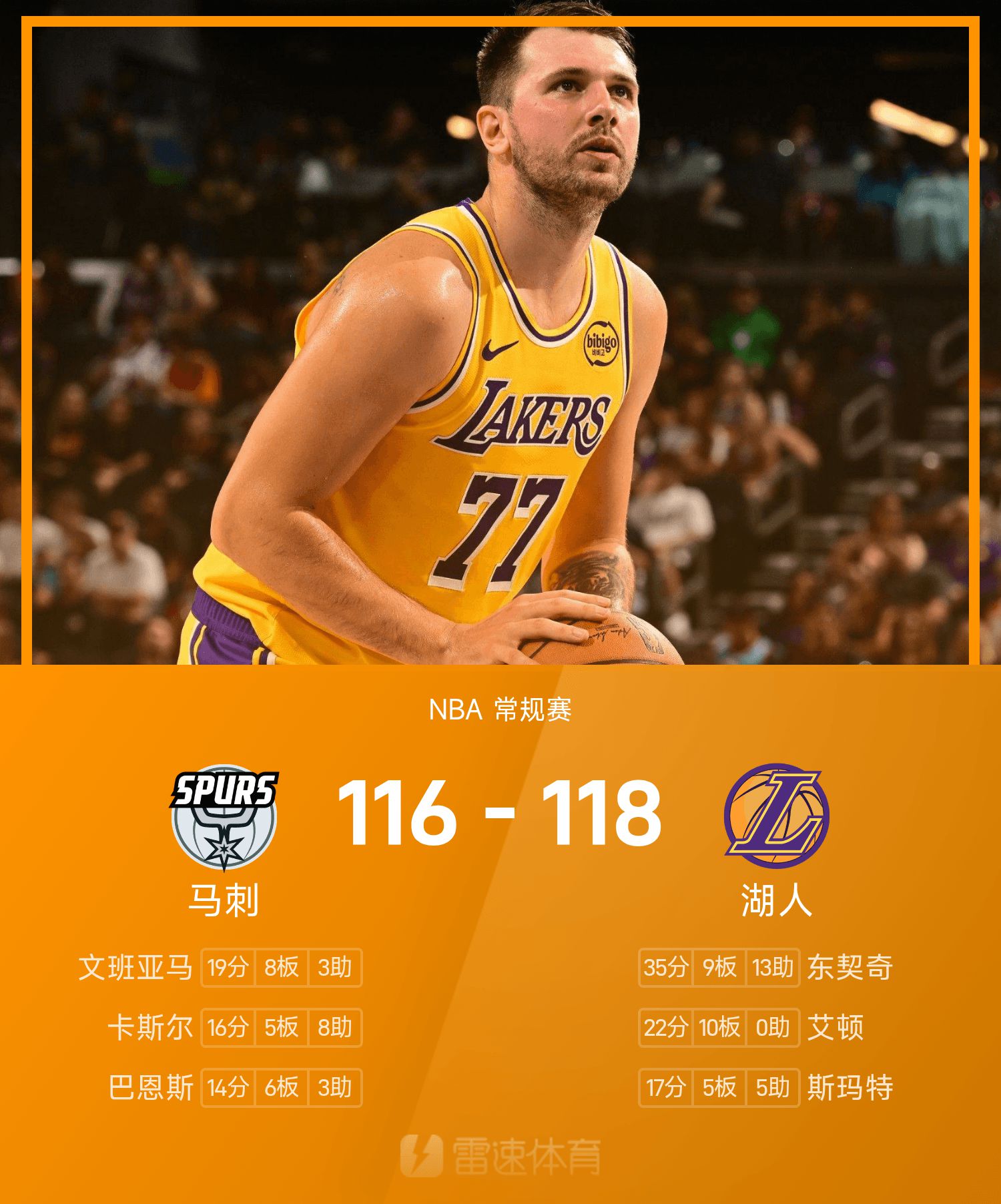 รายงานเกม NBA ดอนซิชมี 35 แต้ม 9 รีบาวด์ 13 แอสซิสต์ เลเกอร์สเอาชนะสเปอร์ส 118-116 อย่างหวุดหวิด