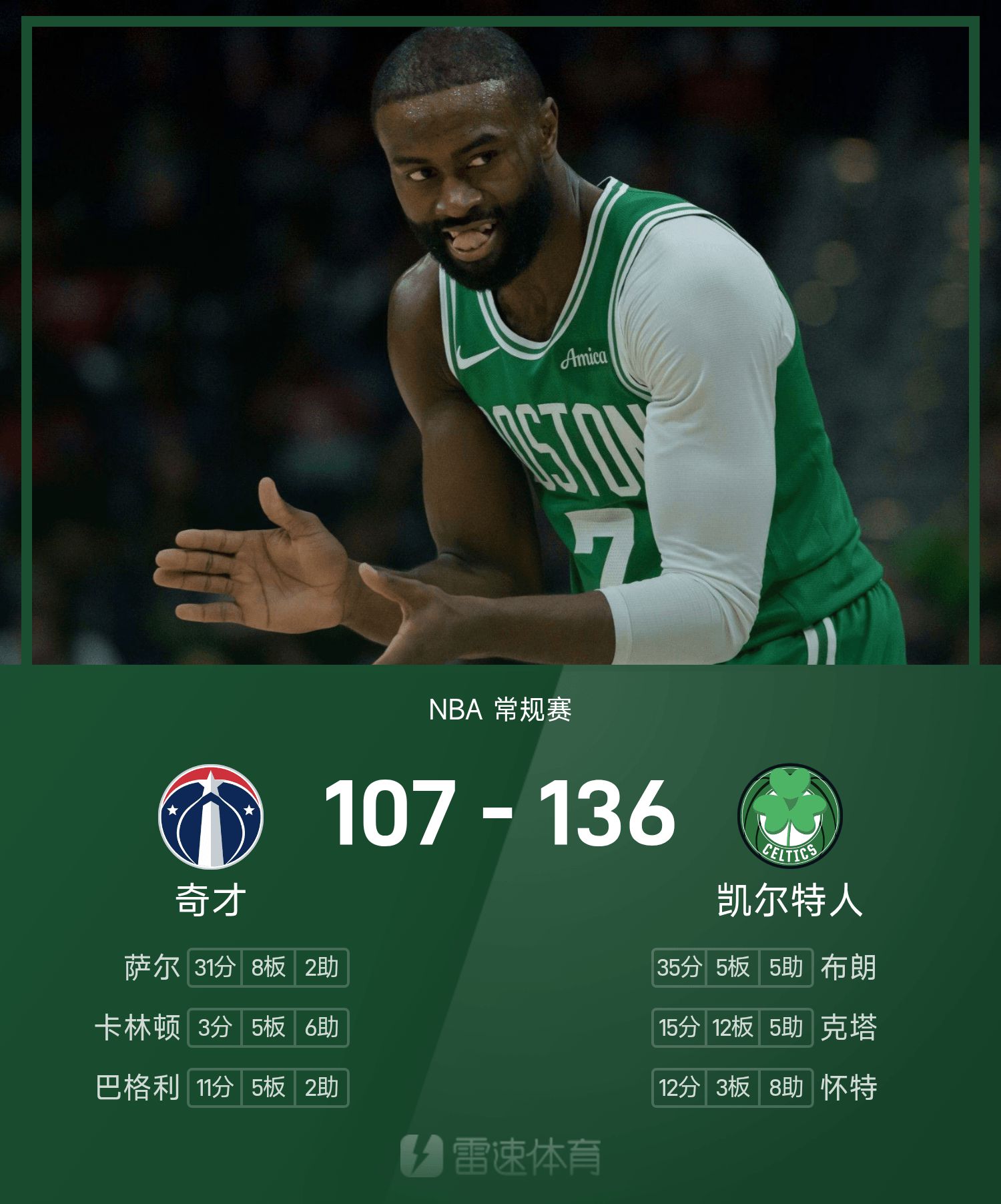 รายงาน NBA: บราวน์ทำคะแนน 35 แต้ม เซลติกส์เอาชนะวิซาร์ดส์ 136-107
