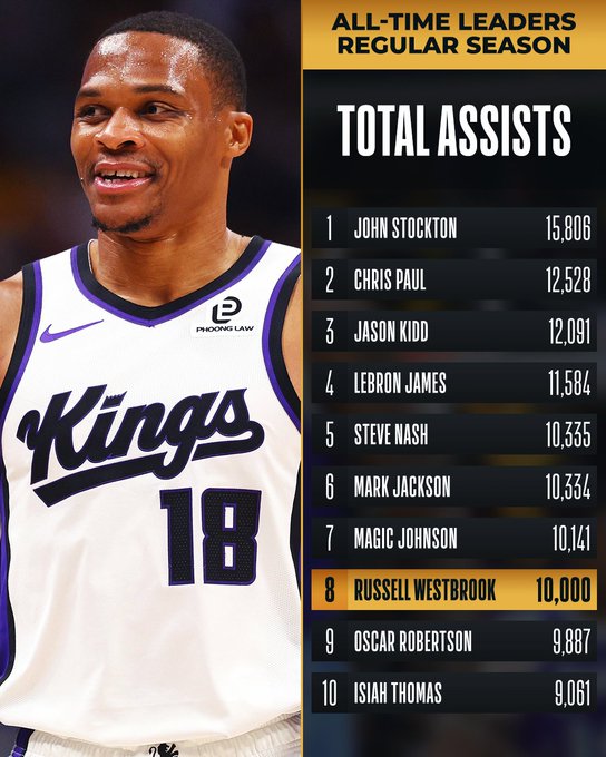 ปัจจุบัน ผู้เล่นของ Kings เวสต์บรูกทำไปแล้ว 10,000 แอสซิสต์ในอาชีพของเขา เขาเป็นผู้เล่นคนที่แปดในประวัติศาสตร์ NBA ที่เข้าถึงสถิตินี้ได้