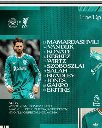 รายชื่อผู้เล่นตัวจริงของลิเวอร์พูล:25-Mamardashvili, 4-Van Dijk, 5-Konate, 6-Kyle Kez, 12-Bradley, 8-Szoboszlai, 17-โจนส์, 18-กัคโป, 7-วิลต์ซ, 11-ซาลาห์, 22-เอคิติช