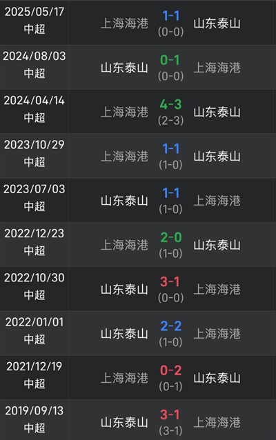 ในการเผชิญหน้า 10 ครั้งล่าสุดระหว่างทั้งสองฝ่ายในไชนีสซูเปอร์ลีก ไท่ซานชนะ 3 เสมอ 4 และแพ้ 3 และทั้งสองฝ่ายเท่าเทียมกัน อย่างไรก็ตาม ชัยชนะทั้ง 3 ครั้งของไท่ซานนั้นยังห่างไกลนัก โดยเกิดขึ้นในปี 2019, 2021 และ 2022 ตามลำดับ