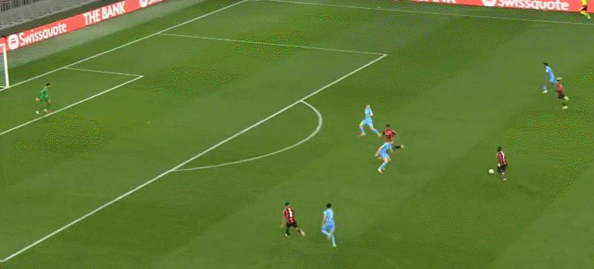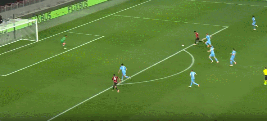 77’ บูดูเวได้บอลนอกเขตสามวินาทีแล้วยิงจากด้านนอกทันที บอลข้ามคานและบินออกนอกเส้นหลัง