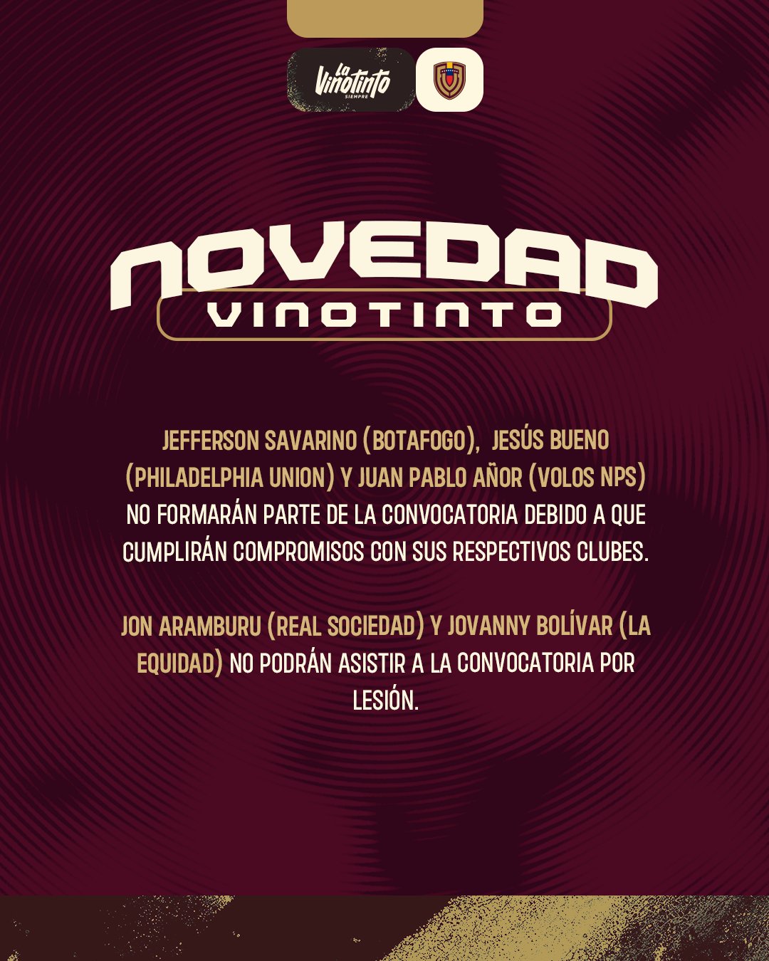6686 ข่าวกีฬา เมื่อวันที่ 13 พฤศจิกายน ทีมชาติเวเนซุเอลาได้ประกาศอย่างเป็นทางการว่า ซาวาริโนของโบตาโฟโก, อาร์โนของโวลอส และบูเอโนของฟิลาเดลเฟีย ยูเนี่ยน ไม่สามารถรายงานการแข่งขันของสโมสรได้และพลาดการแข่งขันกับออสเตรเลีย
