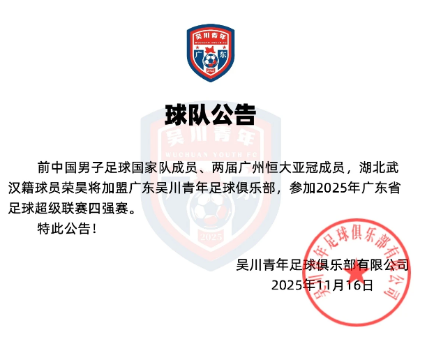 เป็นทางการ: หรงห่าวเข้าร่วม Guangdong Wuchuan Youth และเข้าร่วมในรอบรองชนะเลิศของ Guangdong Football Super League