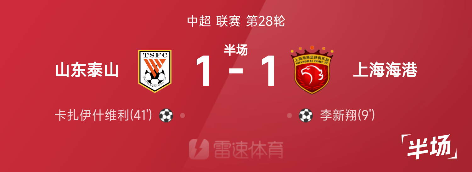 ไชนีส ซูเปอร์ลีก พักครึ่ง : หลี่ ซินเซียง ยิงประตู, กาซ่า ตีเสมอ, ไท่ซาน ขึ้นนำ ไห่กัง 1-1 ชั่วคราว