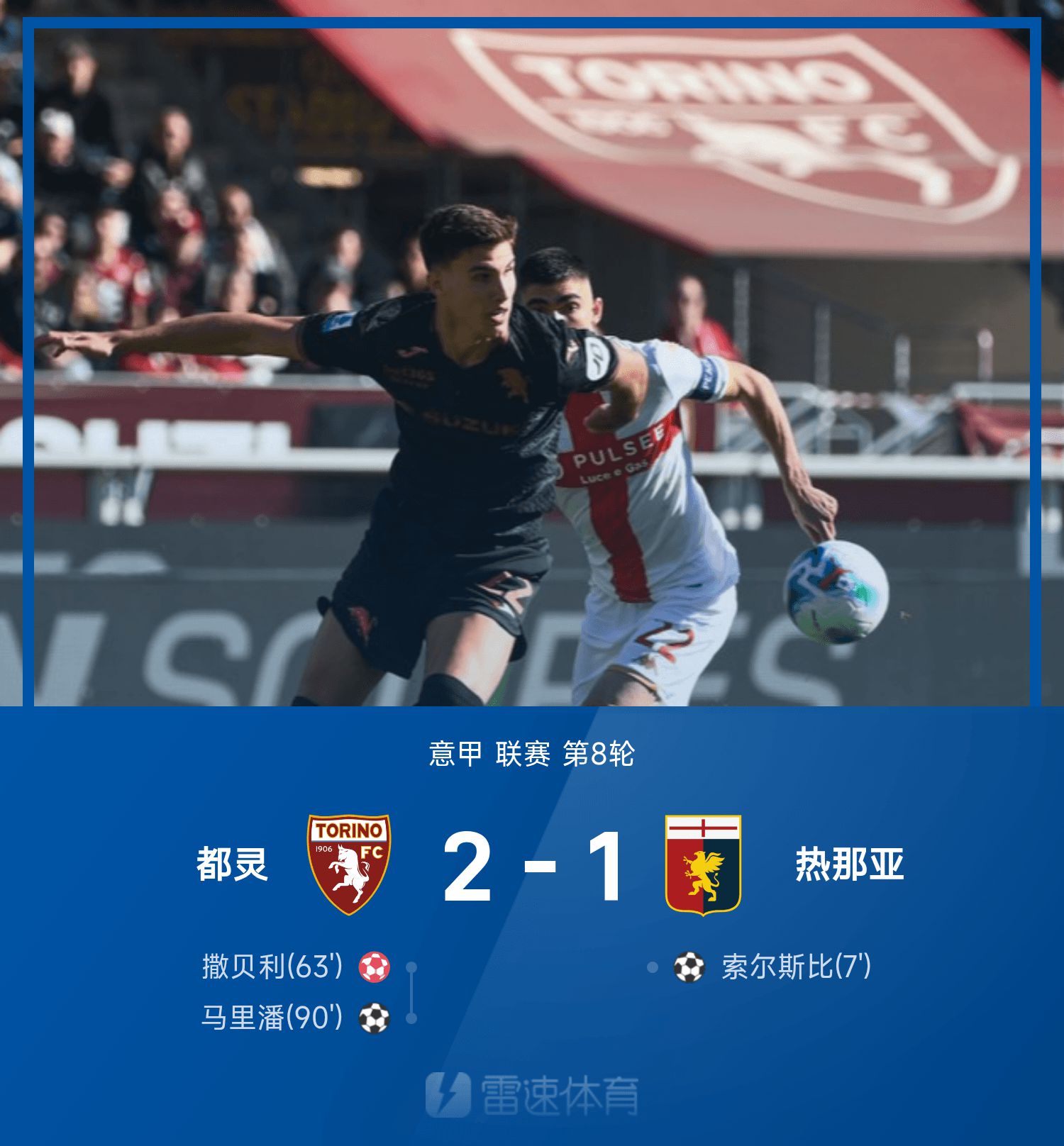 6686 กีฬา 26 ตุลาคม ในรอบที่ 8 ของฤดูกาล 25/26 กัลโช่ ตูรินเอาชนะเจนัว 2-1 ครึ่งแรกโซลสบี้ทำสำเร็จแบบสายฟ้าแลบ แต่สถานการณ์พลิกผันกะทันหันในครึ่งหลัง ซาเบลลี่ทำเข้าประตูตัวเองช่วยให้ตูรินตีเสมอสกอร์ นาทีสุดท้าย มาริปัน เซ็นเตอร์แบ็คยิงประตูสุดท้าย